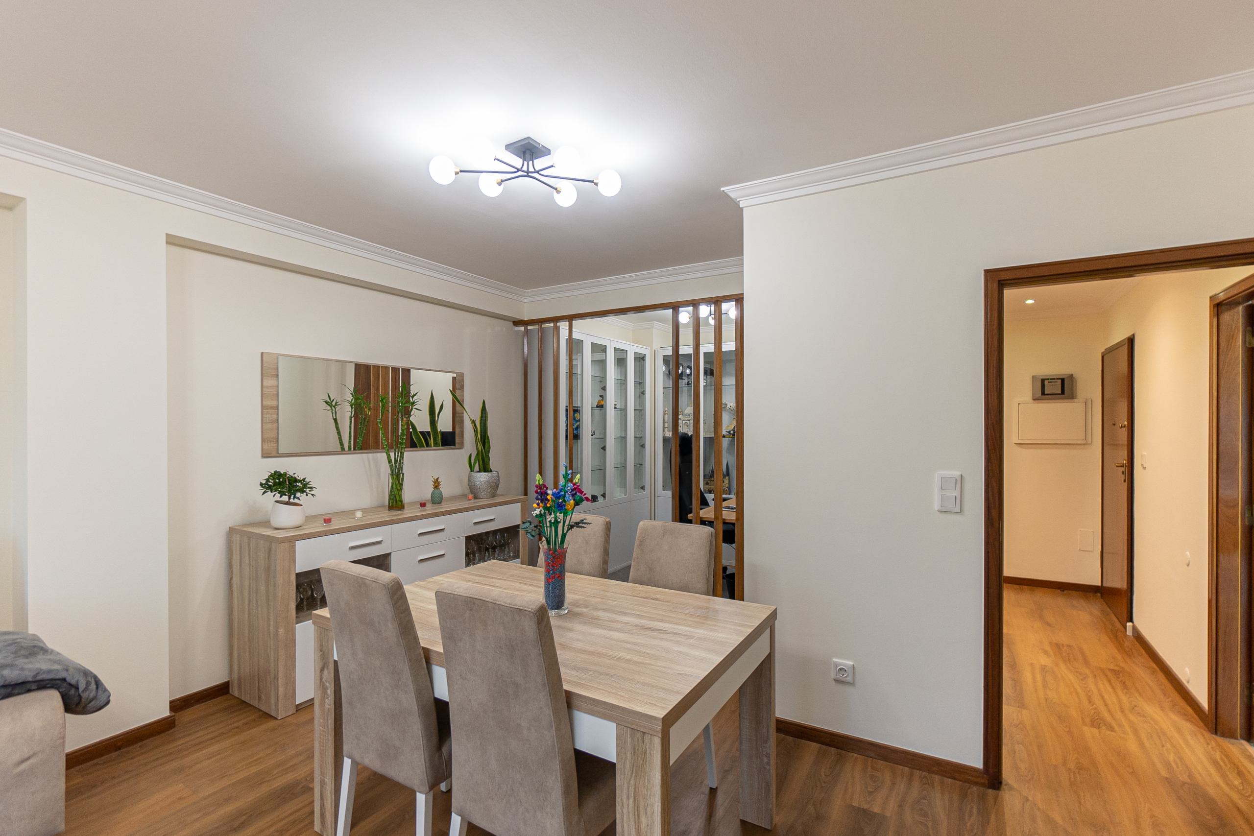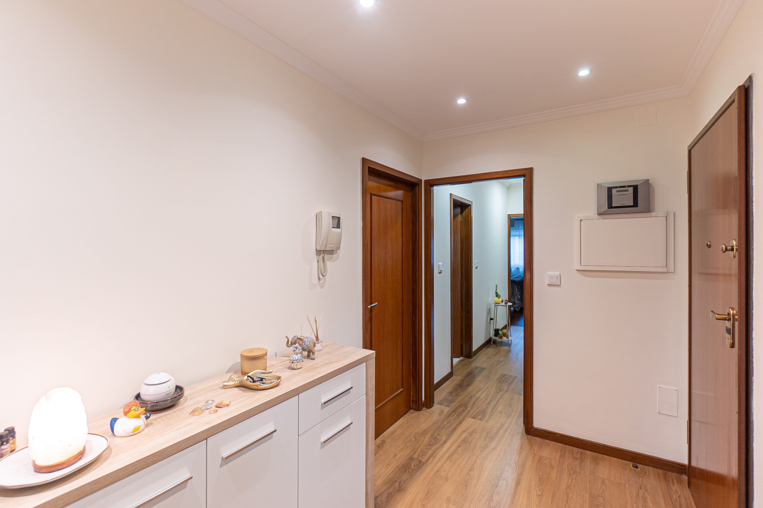 A entrada faz-se por um hall acolhedor que distribui harmoniosamente para a sala, cozinha, +1 (atualmente utilizado como escritório) e hall dos quartos.