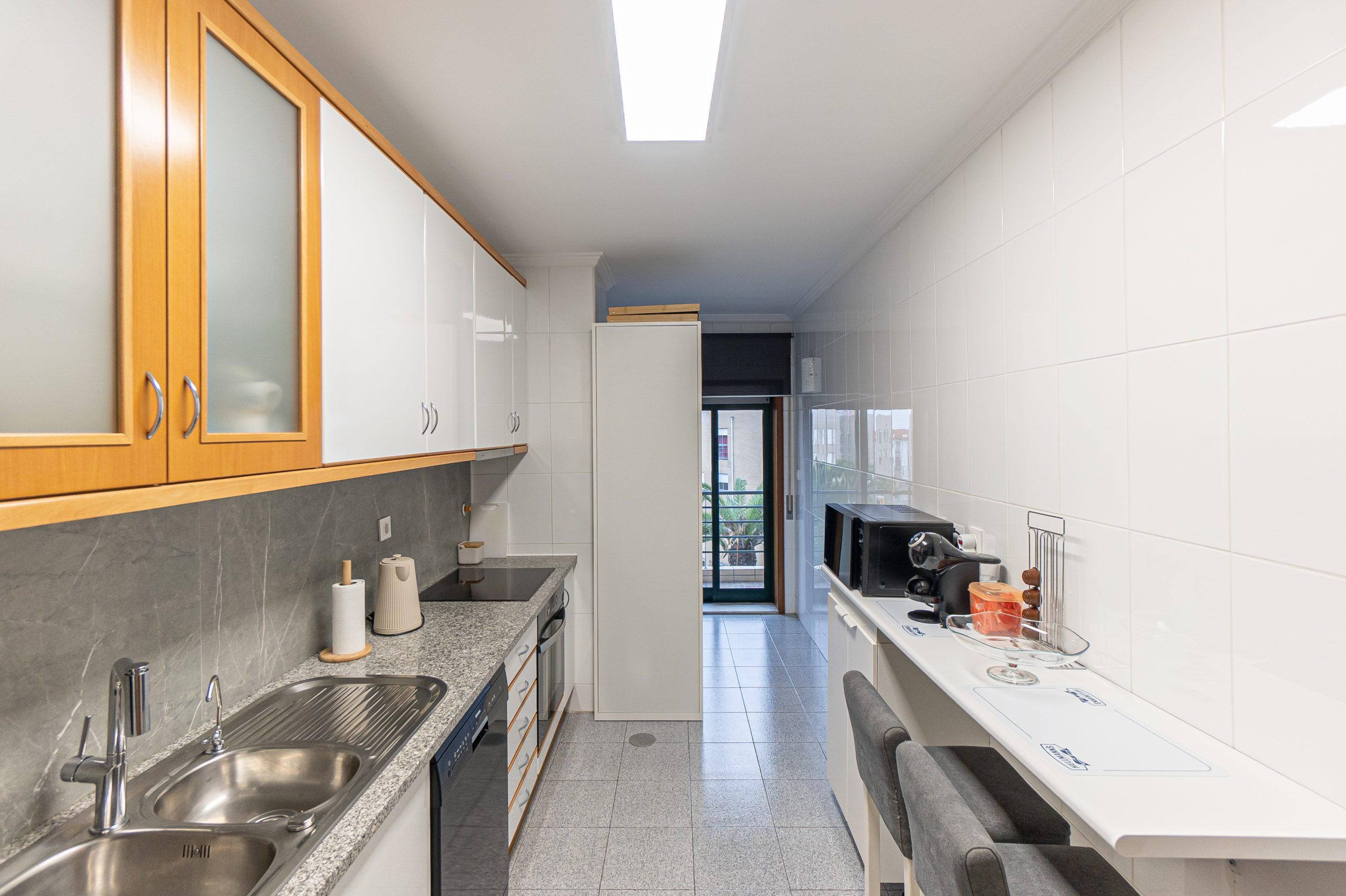 A cozinha, funcional e luminosa, encontra-se equipada com placa, forno e exaustor, tendo acesso direto a uma varanda, tal como a sala — perfeita para momentos de pausa ou lazer.